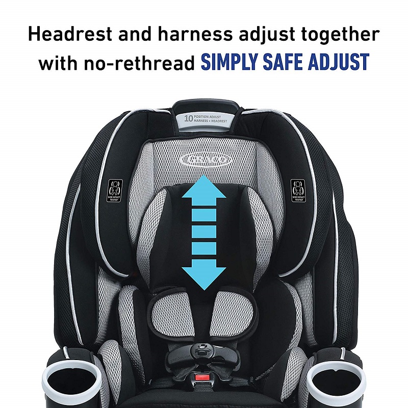 Para um ajuste perfeito, o sistema de ajuste de cinto Simply Safe Adjust e o apoio de cabeça com 10 posições permitem ajustar o cinto e o apoio de cabeça simultaneamente, sem precisar passar os cintos novamente.
